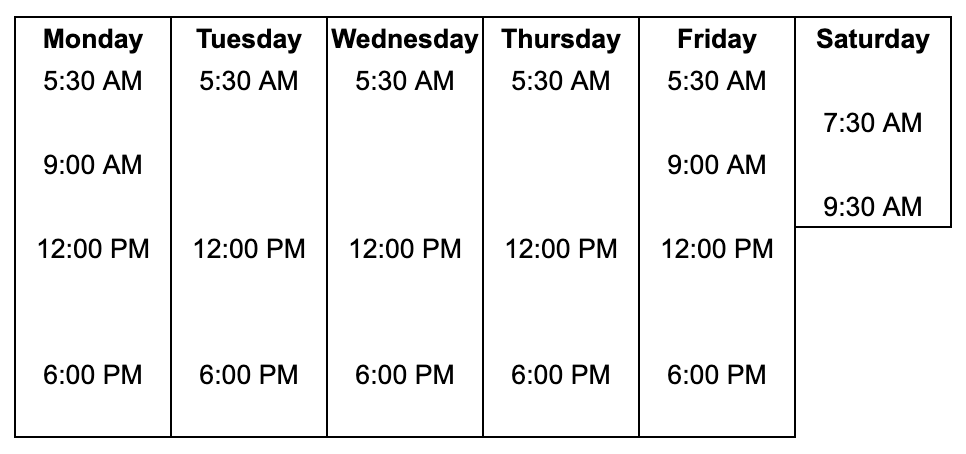 Click to view and enlarge. Class times are subject to change, contact this gym to verify the schedule.
