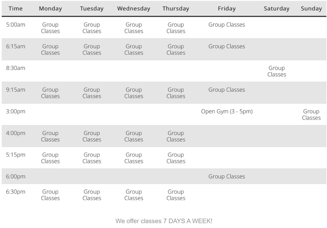 Click to view and enlarge. Class times are subject to change, contact this gym to verify the schedule.