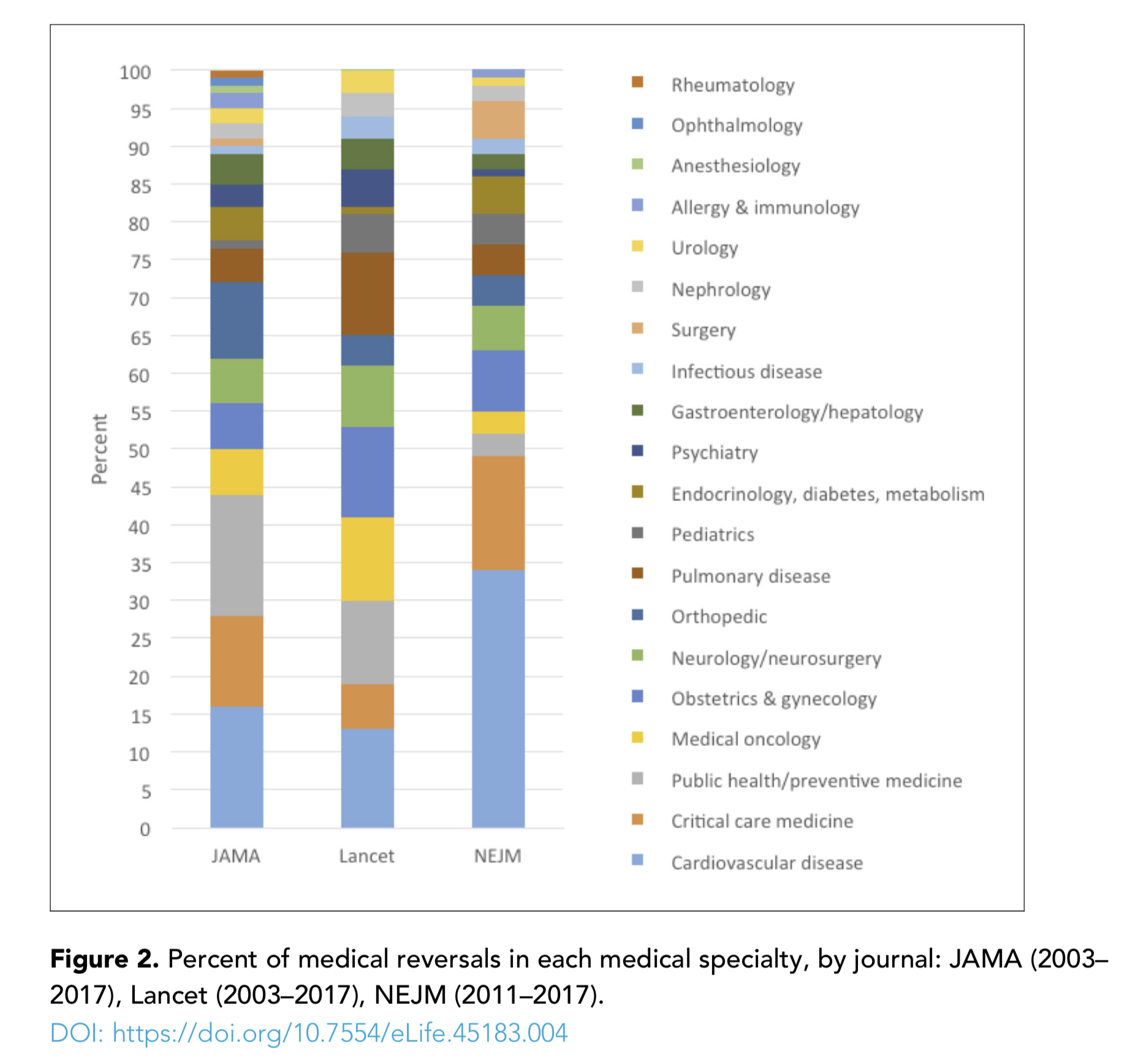 The authors reviewed more than 3,000 randomized controlled trials published in JAMA, the Lancet, and the New England Journal of Medicine between 2003 and 2017 (for NEJM, the survey only covered 2011 to 2017). They found 396 medical reversals spread across a variety of intervention types (e.g., medication, procedure, vitamin/supplement, device) and fields (e.g., cardiovascular disease, preventive medicine, obstetrics and gynecology). Overall, 13% of all randomized controlled trials included reversals, and over half of these reversals were confirmed by subsequent systematic review.